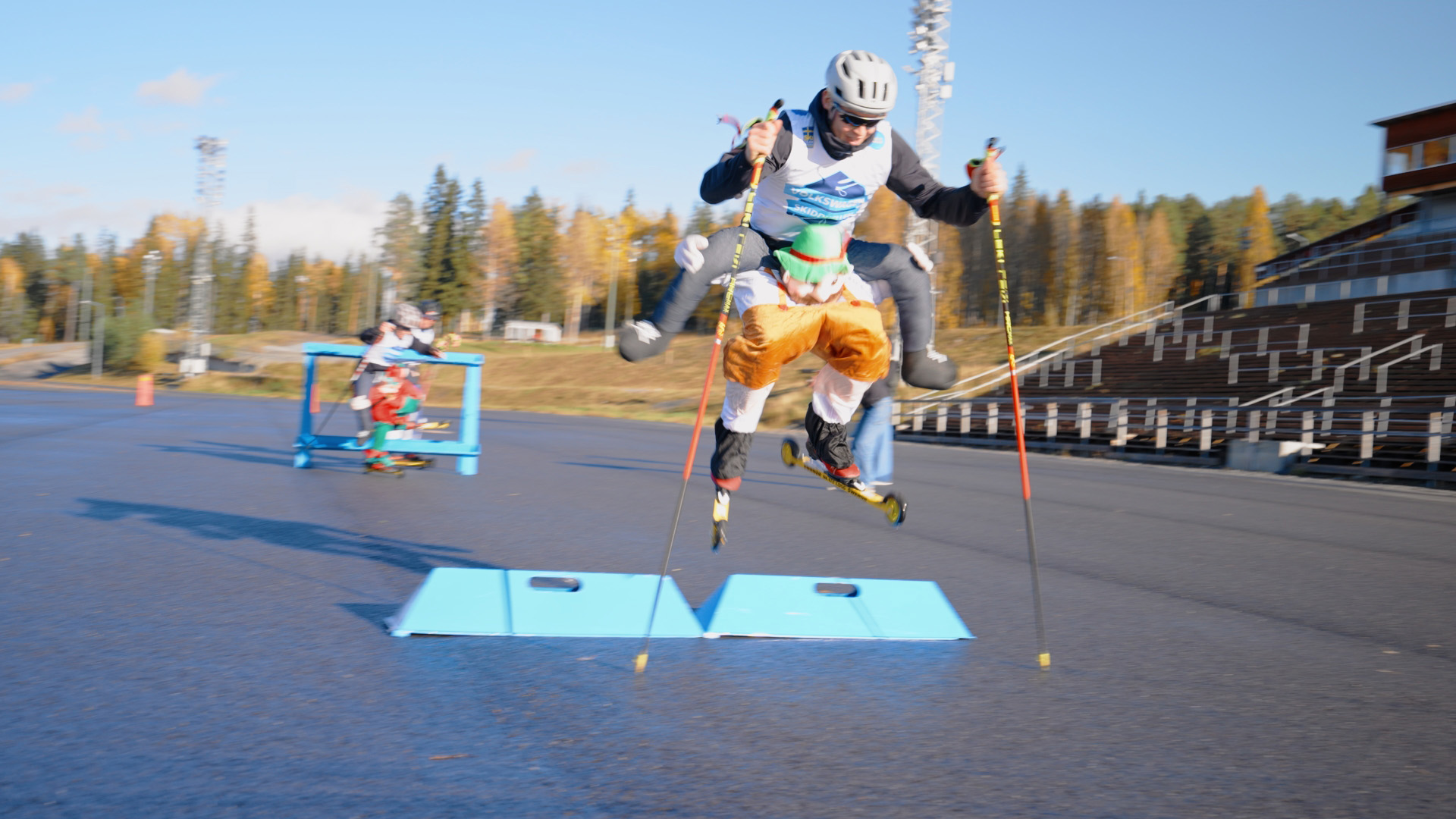 Elbil mot rullskidor, klädstafett och bilquiz – Volkswagen utmanar landslagen i Skidduellen.